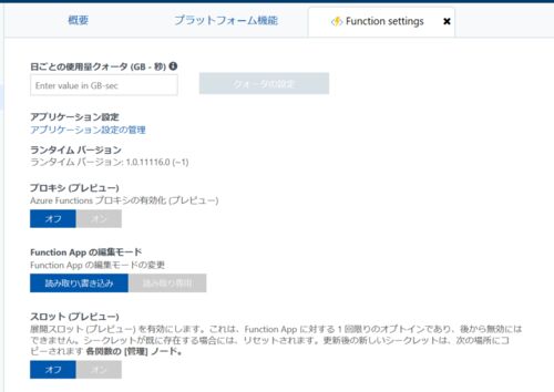Azure Functions は、まだスロットに正式対応していません。現時点ではプレビュー扱いです。 ということで早速使ってみましょう。 スロットの有効化 Function App を作ってポータルで開きます。 そして Function settings を開いてスロットのプレビューをオ…